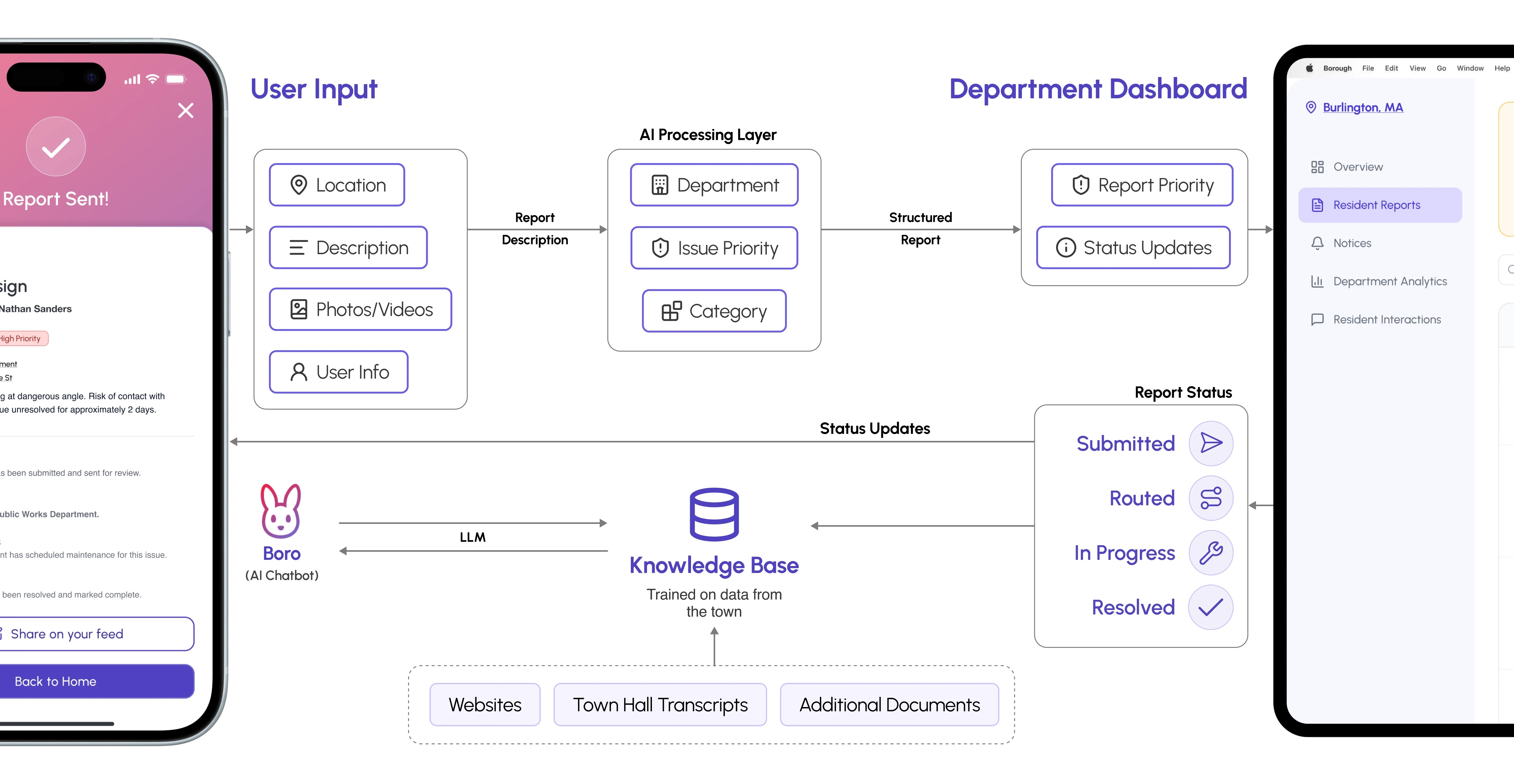 The AI layer processes complex resident input and routes it to the right department, sending back report status to the user.