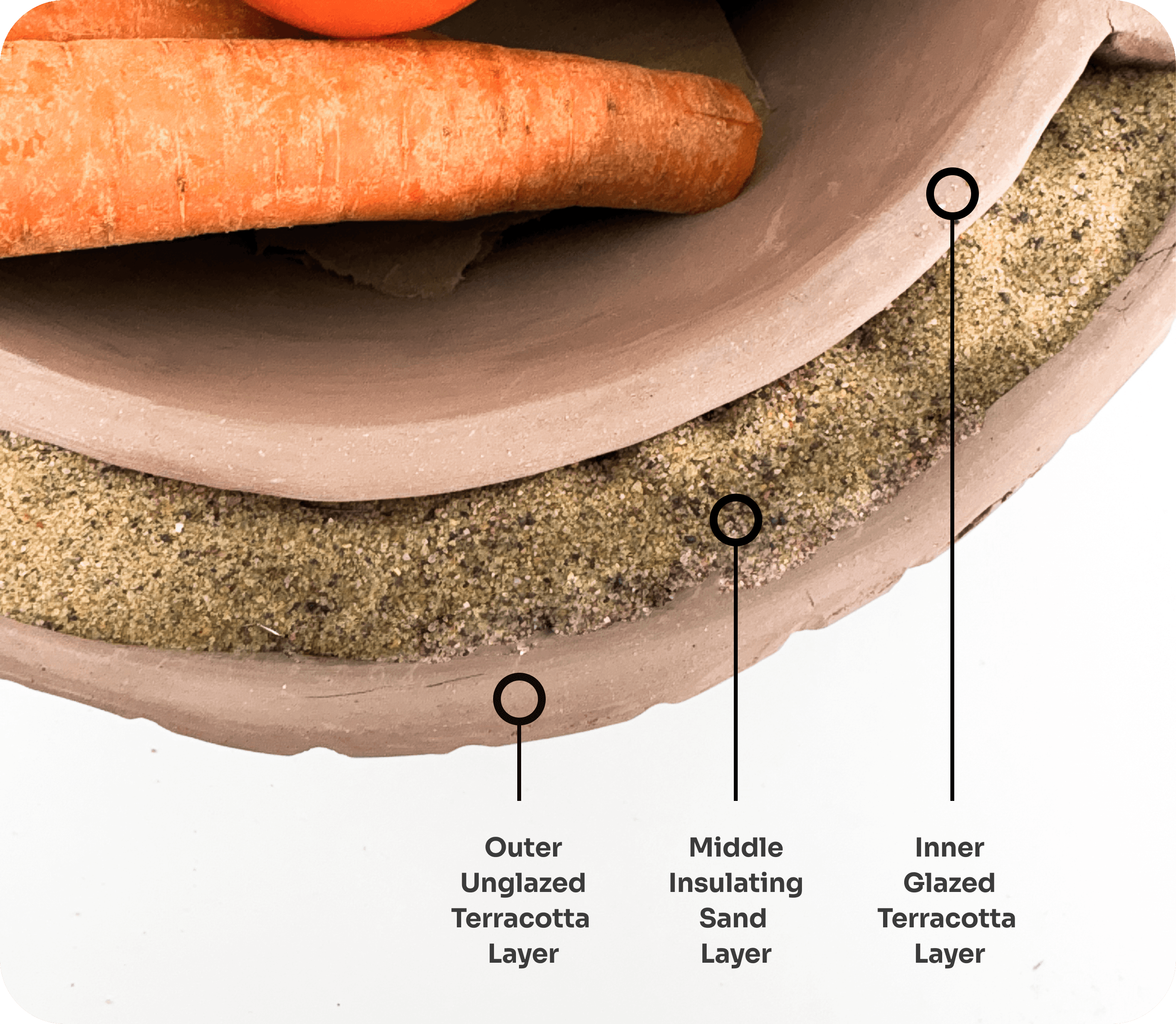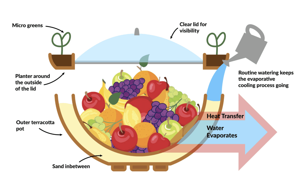 The container is designed with three functional layers: an outer glazed terracotta layer, an inner unglazed terracotta layer, and a middle insulating layer filled with sand or clay pebbles. Water from the planter seeps through small openings into the insulating layer, which absorbs and distributes the moisture along the container walls. The porous inner layer then absorbs this moisture, creating a natural evaporative cooling effect that maintains a cool internal temperature, extending the freshness of stored produce.