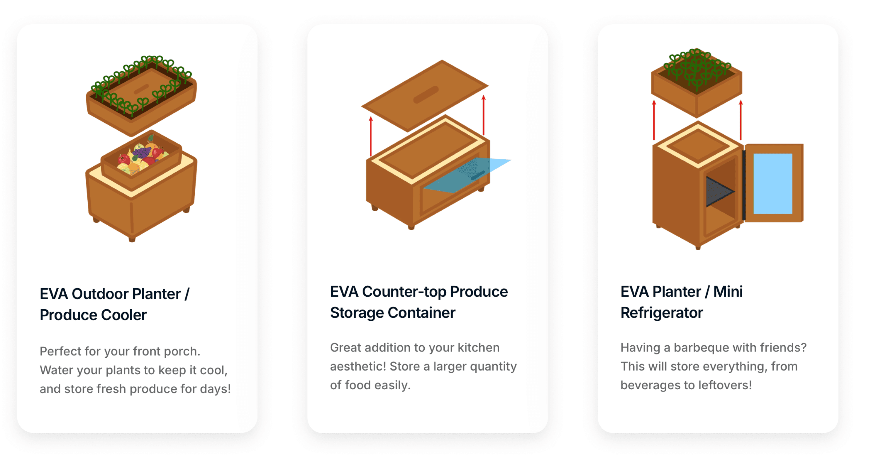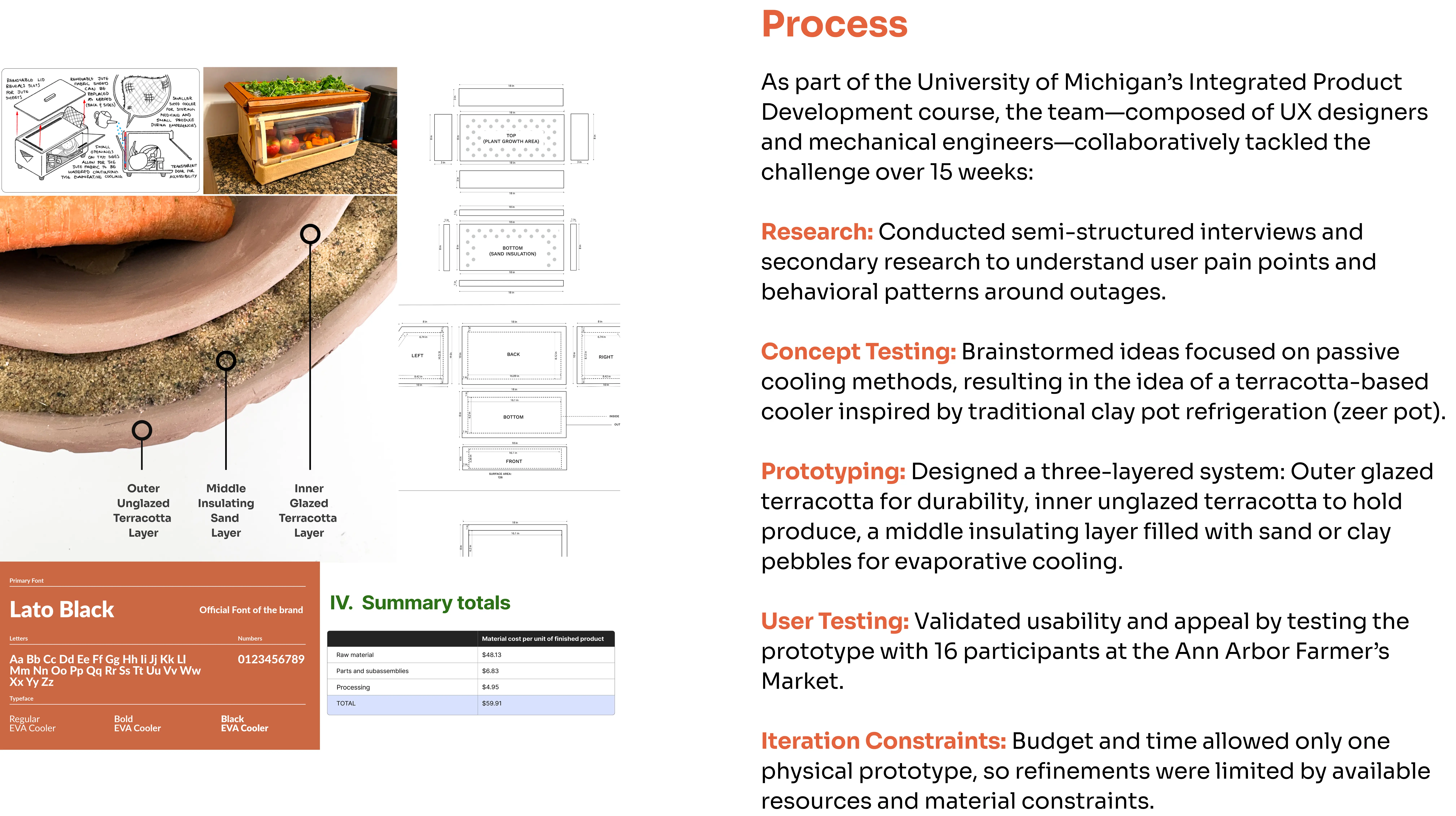EVA is a sustainable, electricity-free cooler designed to triple the freshness of produce by simply watering it regularly. Developed by a team of UX designers and mechanical engineers during the UM Ross School of Business's "Integrated Product Development" course, EVA combines innovation and simplicity to promote eco-friendly food preservation.