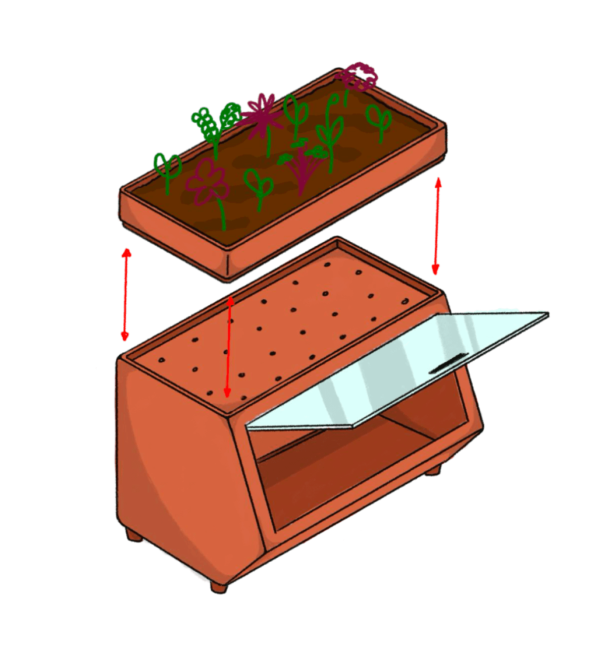 Eva extends the shelf life of your produce by at least two weeks. Its design features two key components: a produce container and a planter on top. No electricity is needed—simply water the plants to maintain a cool environment. The transparent, insulated ceramic door allows easy visibility of the stored produce, combining functionality with sustainability.