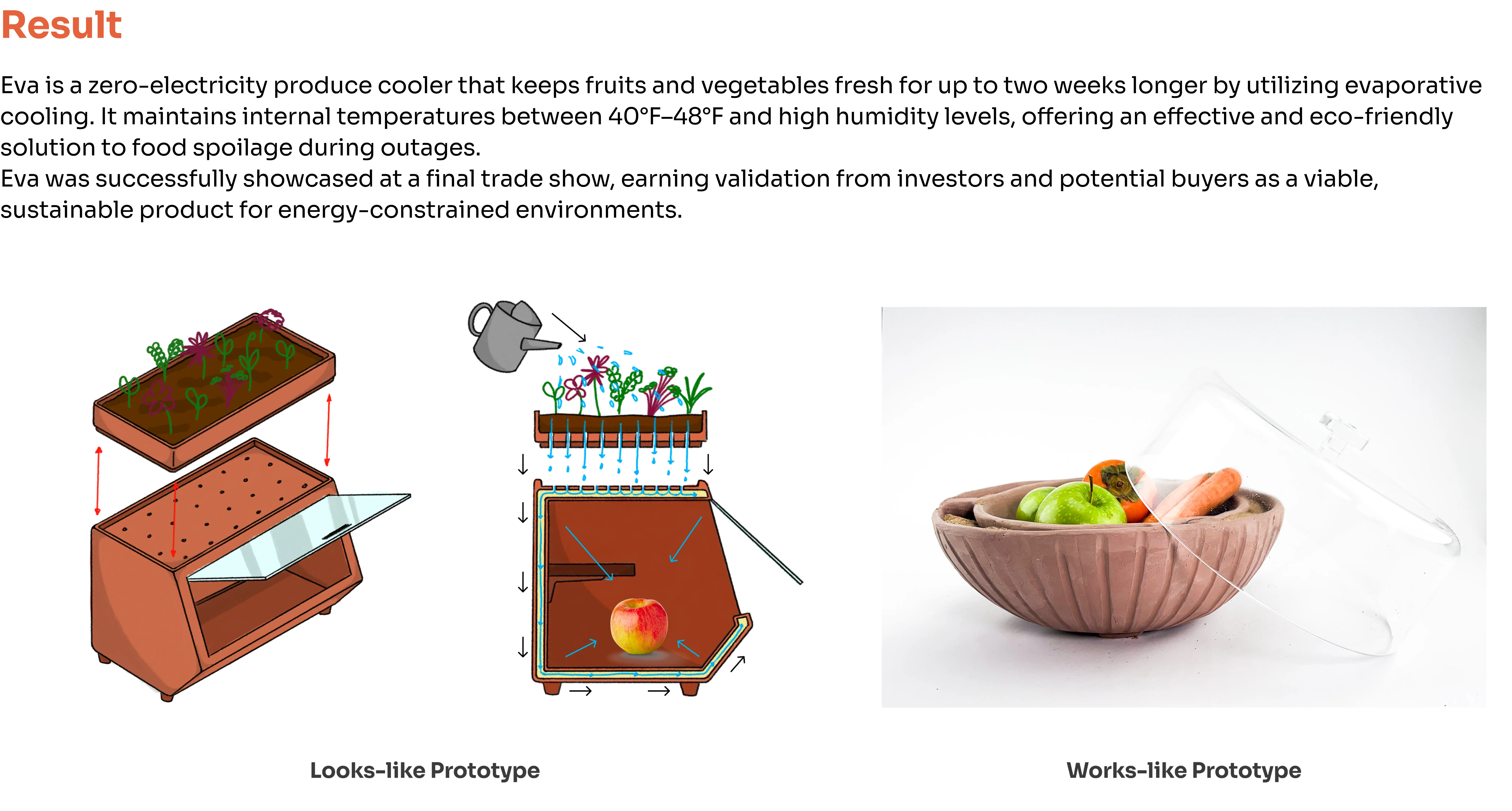 During the trade show, our marketing strategy emphasized that we weren’t just selling Eva as a product, but as a concept. Natural evaporative cooling, a technique used for thousands of years, is largely overlooked in modern first-world nations. In today’s tech-driven society seeking sustainability and environmental responsibility, Eva reintroduces this ancient concept with potential applications beyond food storage.