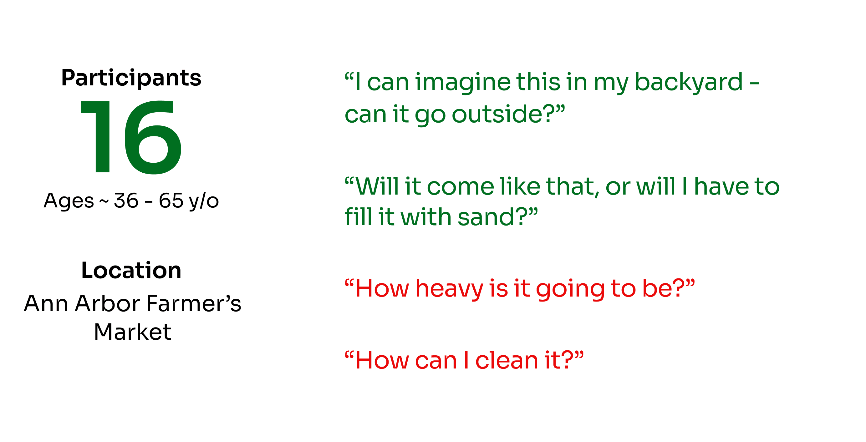User testing was conducted with 16 participants at the Ann Arbor Farmer's Market — a key location for our target audience.